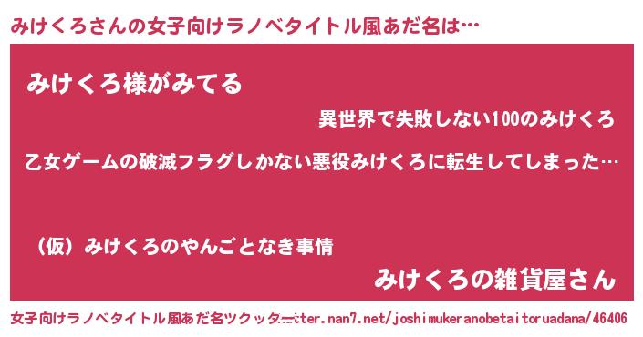 | 男性向けラノベタイトル風あだ名 | 『魔弾の王とみけくろ』『みけくろの憂鬱』 |