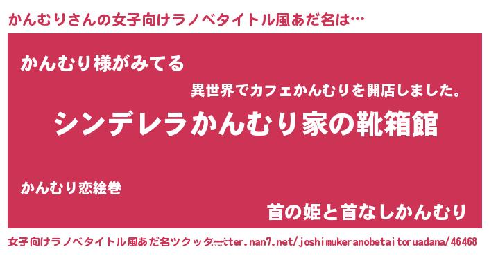 かんむりさんの女子向けラノベタイトル風あだ名は… 『シンデレラかんむり家の靴箱館』『かんむり様がみてる』『首の姫と首なしかんむり』 ツクッター #女子向けラノベタイトル風あだ名ツクッター http://tkutter.nan7.net/joshimukeranobetaitoruadana/46468/