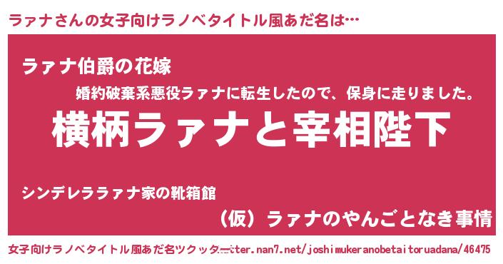 ラァナさんの女子向けラノベタイトル風あだ名は… 『横柄ラァナと宰相陛下』『ラァナ伯爵の花嫁』『(仮)ラァナのやんごとなき事情』 ツクッター #女子向けラノベタイトル風あだ名ツクッター http://tkutter.nan7.net/joshimukeranobetaitoruadana/46475/