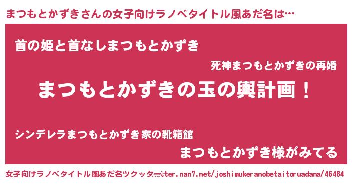 | 男性向けラノベタイトル風あだ名 | 『まつもとかずき~年齢イコール彼女いない歴の魔法使い~』 |
