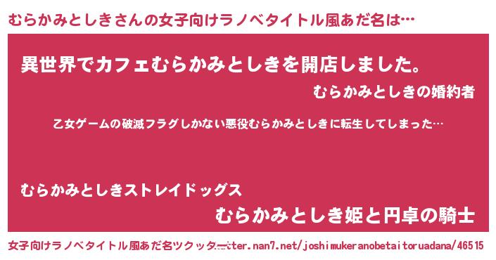 | 男性向けラノベタイトル風あだ名 | 『この素晴らしい世界にむらかみとしきを!』 |
