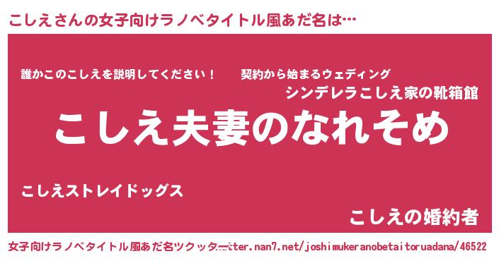 | 男性向けラノベタイトル風あだ名 | 『おまえをオタクにしてやるから、俺をこしえにしてくれ! 』 |