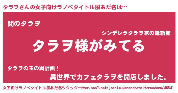 | 男性向けラノベタイトル風あだ名 | 『タラヲの嫁は女の子じゃないと思った?』 |