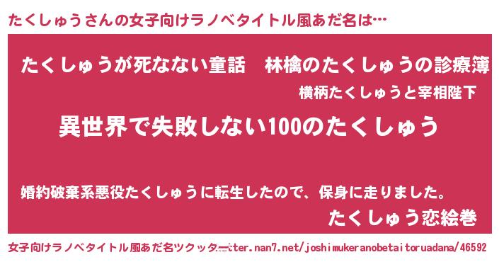 | 男性向けラノベタイトル風あだ名 | 『たくしゅうという概念が存在しない退屈な世界 』 |