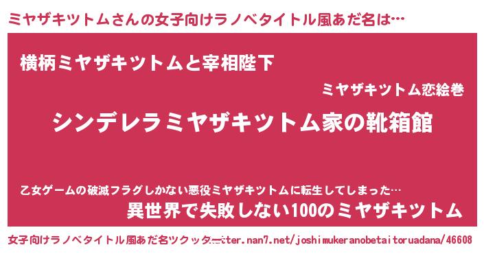 | 男性向けラノベタイトル風あだ名 | 『冴えないミヤザキツトムの育てかた』 |