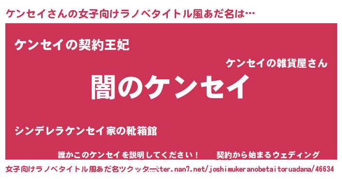 | 男性向けラノベタイトル風あだ名 | 『Re:ケンセイから始める異世界生活』 |