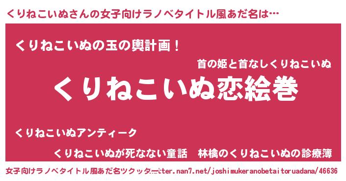 | 男性向けラノベタイトル風あだ名 | 『おまえをオタクにしてやるから、俺をくりねこいぬにしてくれ! 』 |