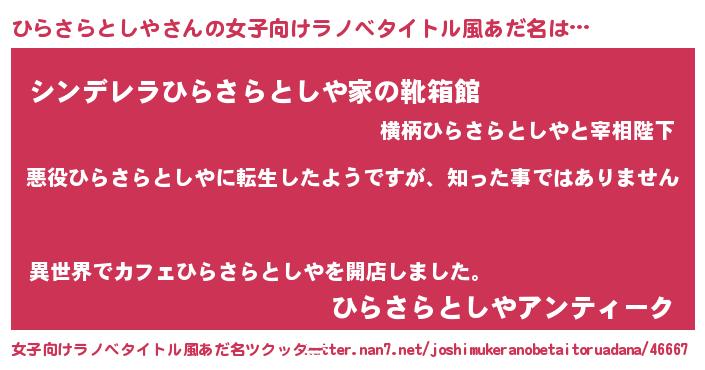 | 男性向けラノベタイトル風あだ名 | 『この素晴らしい世界にひらさらとしやを!』 |