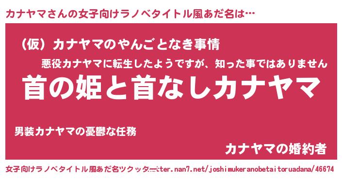 カナヤマさんの女子向けラノベタイトル風あだ名は… 『首の姫と首なしカナヤマ』『(仮)カナヤマのやんごとなき事情』『カナヤマの婚約者』 ツクッター #女子向けラノベタイトル風あだ名ツクッター http://tkutter.nan7.net/joshimukeranobetaitoruadana/46674/