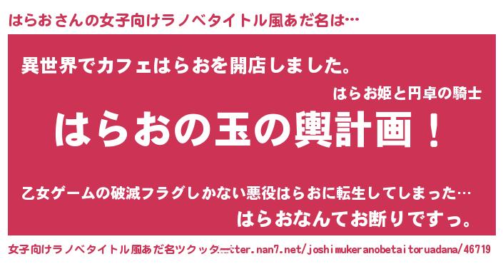 | 男性向けラノベタイトル風あだ名 | 『転生したらはらおだった件』 |