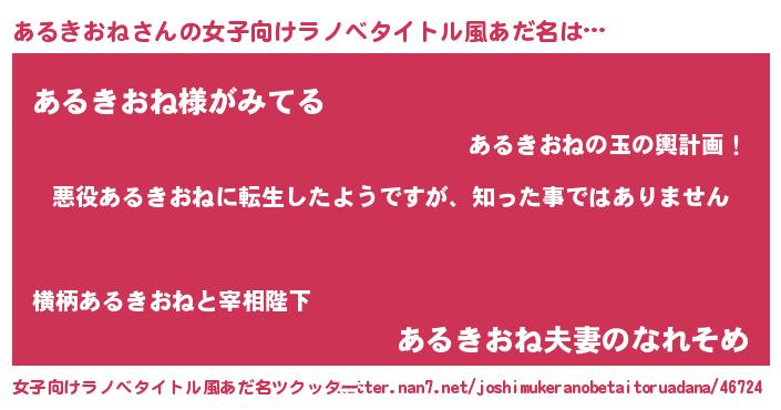 | 男性向けラノベタイトル風あだ名 | 『この素晴らしい世界にあるきおねを!』 |