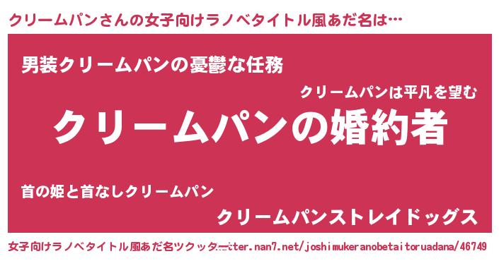 | 男性向けラノベタイトル風あだ名 | 『うちの娘の為ならば、俺はもしかしたらクリームパンも倒せるかもしれない。』 |