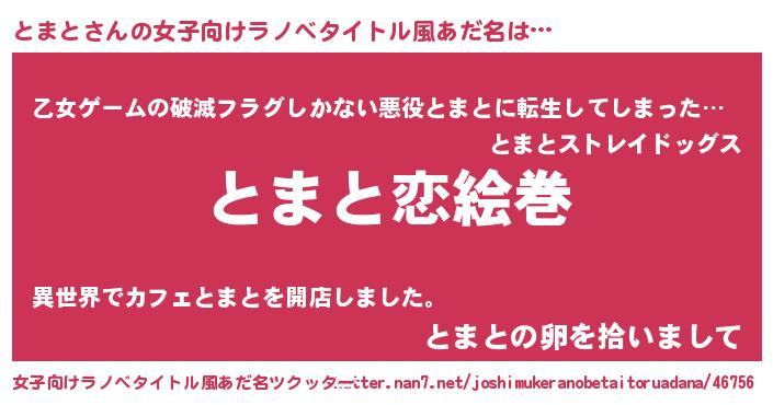 | 男性向けラノベタイトル風あだ名 | 『おまえをオタクにしてやるから、俺をとまとにしてくれ! 』 |
