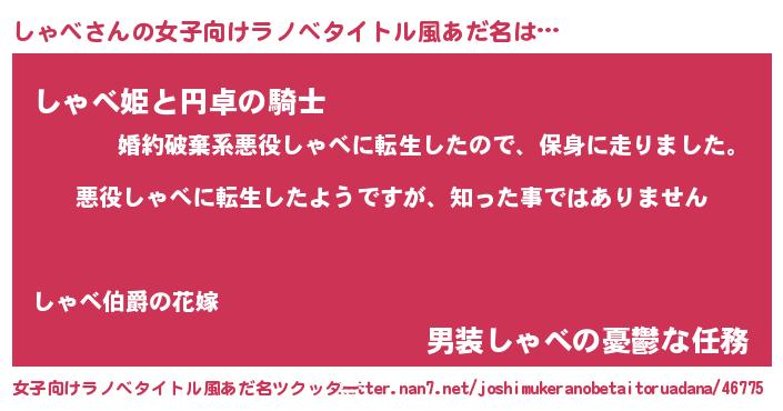 | 男性向けラノベタイトル風あだ名 | 『この素晴らしい世界にしゃべを!』 |
