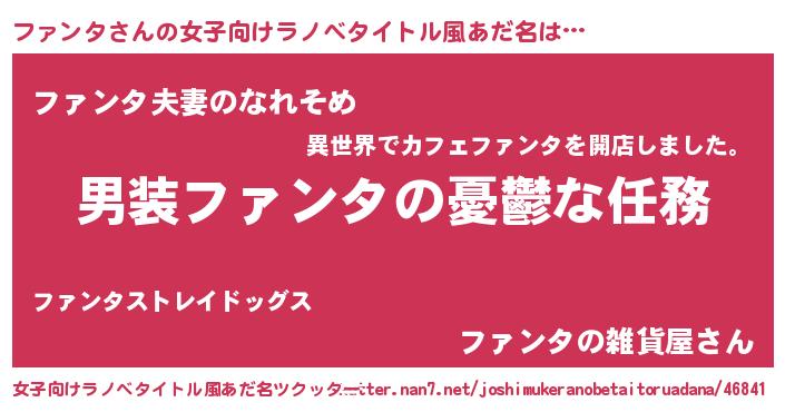 | 男性向けラノベタイトル風あだ名 | 『うちのファンタが世界を掌握している!』 |