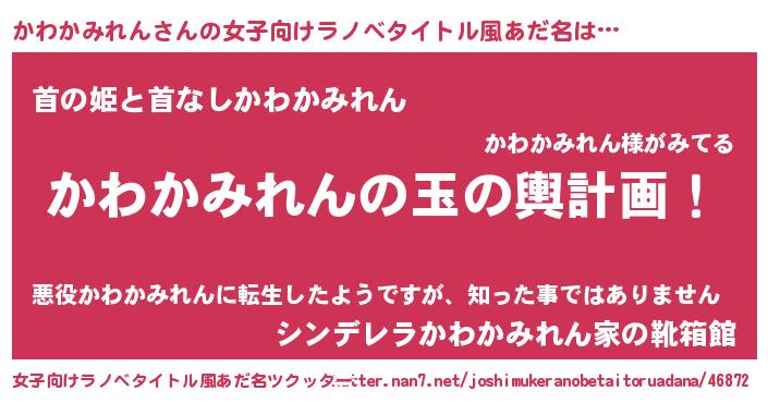 男性向けラノベタイトル風あだ名 | 『かわかみれん~年齢イコール彼女いない歴の魔法使い~』 |