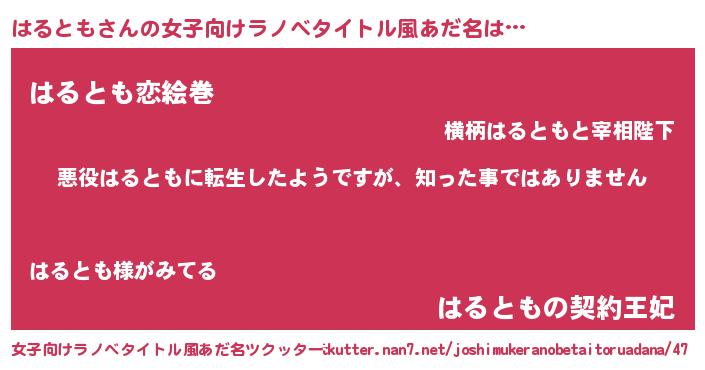 | 男性向けラノベタイトル風あだ名 | 『この素晴らしい世界にはるともを!』 |