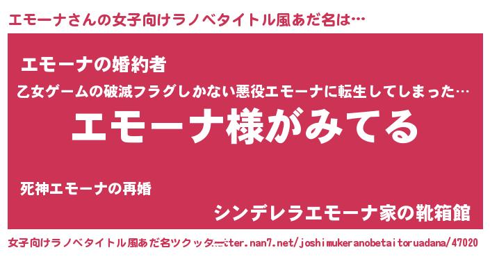 | 男性向けラノベタイトル風あだ名 | 『エモーナの嫁は女の子じゃないと思った?』 |