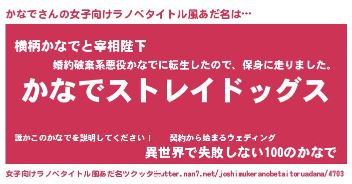 | 男性向けラノベタイトル風あだ名 | 『Re:かなでから始める異世界生活』 |