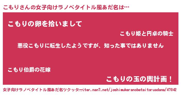 | 男性向けラノベタイトル風あだ名 | 『この素晴らしい世界にこもりを!』 |
