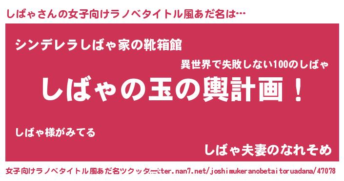 | 男性向けラノベタイトル風あだ名 | 『しばゃ~年齢イコール彼女いない歴の魔法使い~』 |