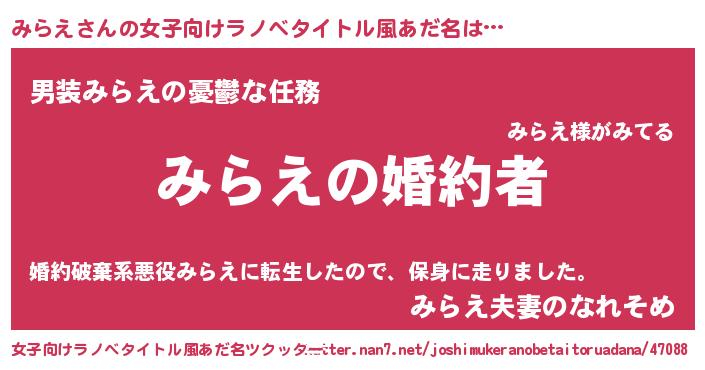 | 男性向けラノベタイトル風あだ名 | 『うちの娘の為ならば、俺はもしかしたらみらえも倒せるかもしれない。』 |