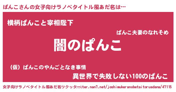 | 男性向けラノベタイトル風あだ名 | 『Re:ぱんこから始める異世界生活』 |