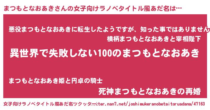 | 胡散臭い通販商品みたいなあだ名 | 『絶対に幸福をもたらす水素水…その名も「まつもとなおあき」』 |