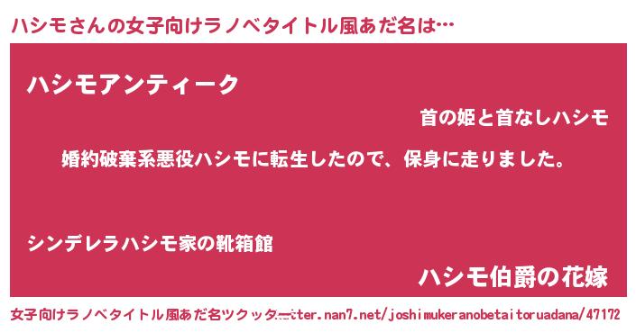| 胡散臭い通販商品みたいなあだ名 | 『テレビで話題のアガリクス…その名も「ハシモ」』 |