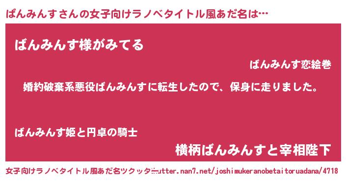 | 男性向けラノベタイトル風あだ名 | 『バンミンススレイヤー』 |
