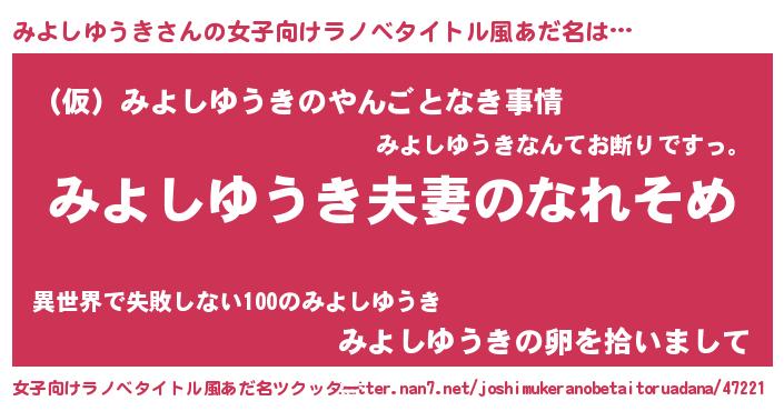 | 男性向けラノベタイトル風あだ名 | 『おまえをオタクにしてやるから、俺をみよしゆうきにしてくれ! 』 |