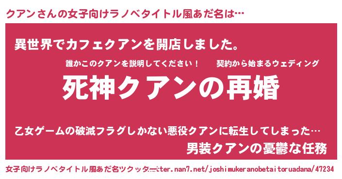 | 男性向けラノベタイトル風あだ名 | 『ノーゲーム・ノークアン』 |