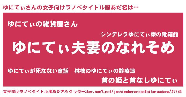 | 男性向けラノベタイトル風あだ名 | 『おまえをオタクにしてやるから、俺をゆにてぃにしてくれ! 』 |