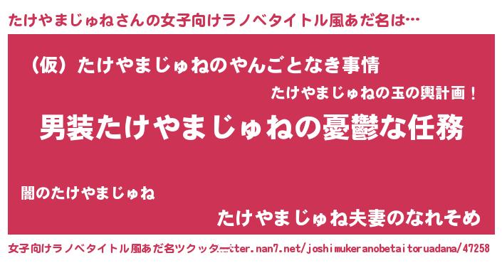 | ヘコむあだ名 | 『たけにー』『たけやまじゅね(震え声)』 |
