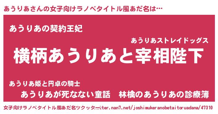 | 意味不明あだ名 | 『永久保存あうりあ』『自称あうりあ』 |