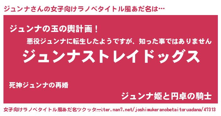 | 男性向けラノベタイトル風あだ名 | 『Re:ジュンナから始める異世界生活』 |