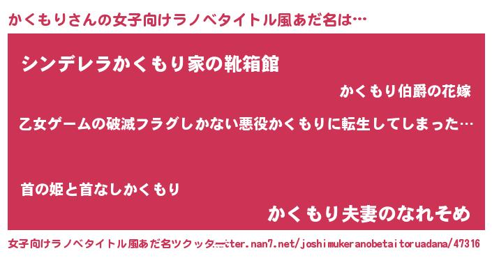 | 男性向けラノベタイトル風あだ名 | 『この素晴らしい世界にかくもりを!』 |