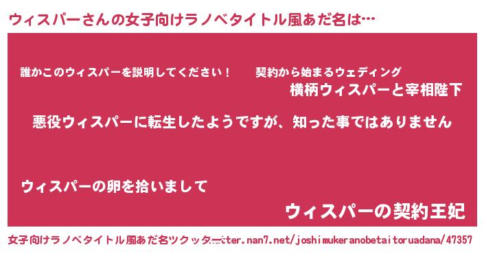 | 男性向けラノベタイトル風あだ名 | 『この素晴らしい世界にウィスパーを!』 |