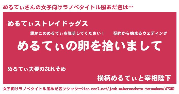 | 男性向けラノベタイトル風あだ名 | 『めるてぃの嫁は女の子じゃないと思った?』 |