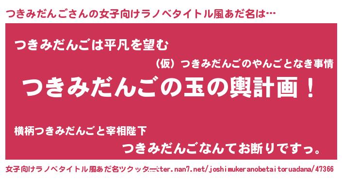 | 男性向けラノベタイトル風あだ名 | 『つきみだんご~年齢イコール彼女いない歴の魔法使い~』 |