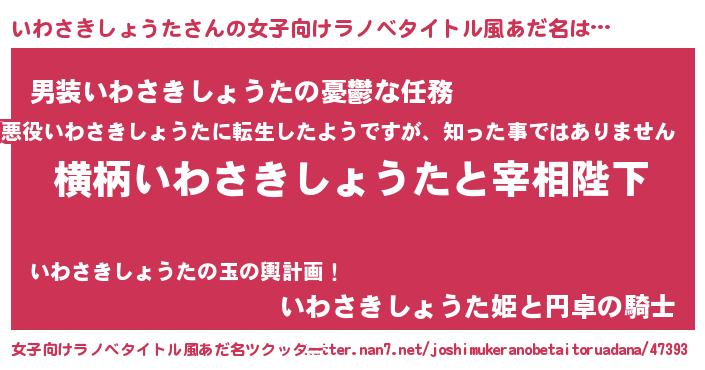 | 男性向けラノベタイトル風あだ名 | 『いわさきしょうたに滅ぼされるだけの簡単なお仕事です』 |