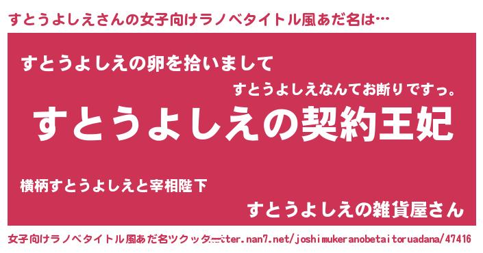 | 胡散臭い通販商品みたいなあだ名 | 『来世でも幸せになれる健康食品…その名も「すとうよしえ」』 |