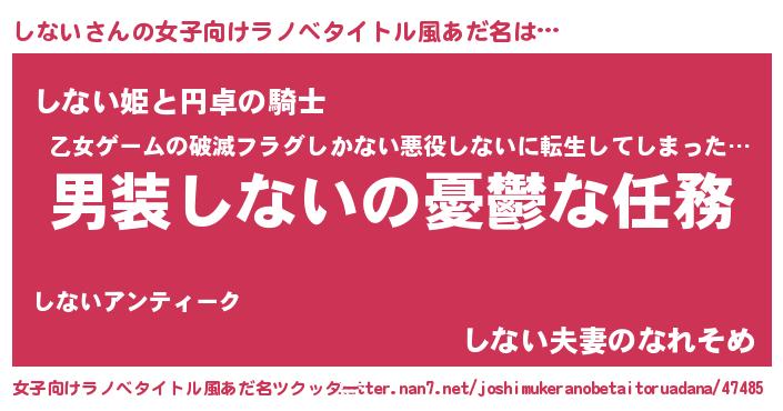 しないさんの女子向けラノベタイトル風あだ名は… 『男装しないの憂鬱な任務』『しない姫と円卓の騎士』『しない夫妻のなれそめ』 ツクッター #女子向けラノベタイトル風あだ名ツクッター http://tkutter.nan7.net/joshimukeranobetaitoruadana/47485/