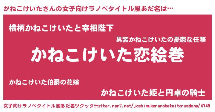 | 男性向けラノベタイトル風あだ名 | 『おまえをオタクにしてやるから、俺をかねこけいたにしてくれ! 』 |