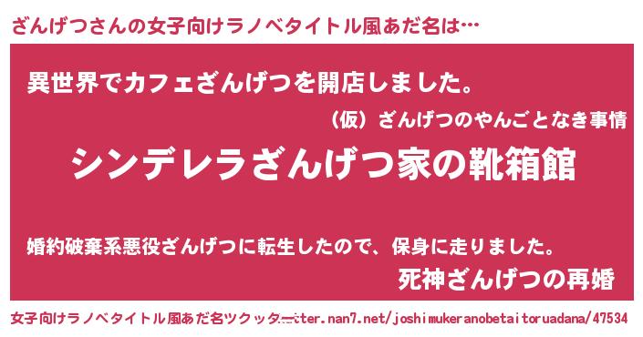 | 男性向けラノベタイトル風あだ名 | 『緋弾のザンゲツ』『ざんげつの憂鬱』 |