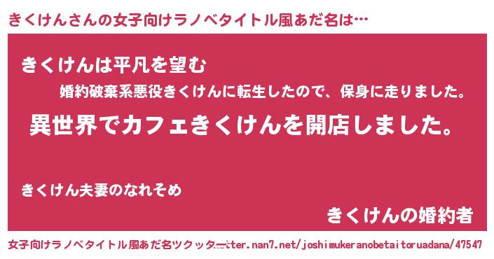 | 男性向けラノベタイトル風あだ名 | 『誰もが恐れるあのきくけんが、ぼくの専属メイドになるようです。』 |
