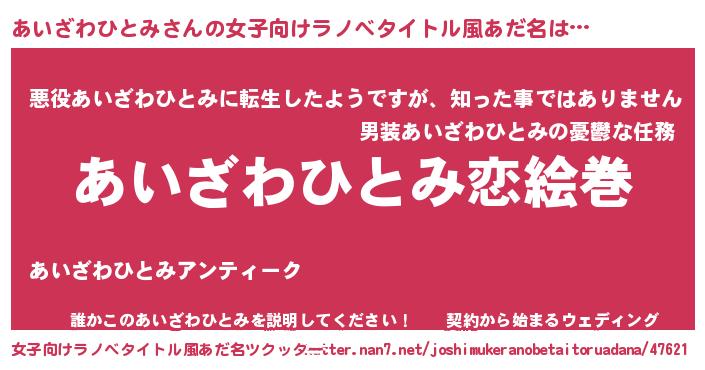 | 男性向けラノベタイトル風あだ名 | 『おまえをオタクにしてやるから、俺をあいざわひとみにしてくれ! 』 |