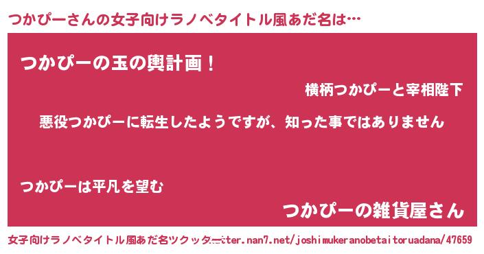 | 男性向けラノベタイトル風あだ名 | 『この素晴らしい世界につかぴーを!』 |
