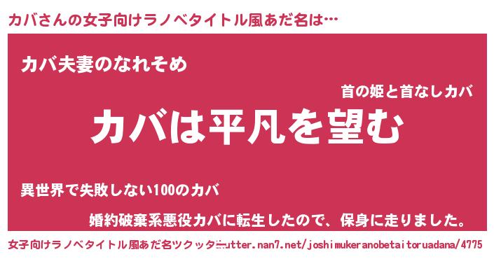 | 男性向けラノベタイトル風あだ名 | 『ダンジョンにカバを求めるのは間違っているだろうか』 |