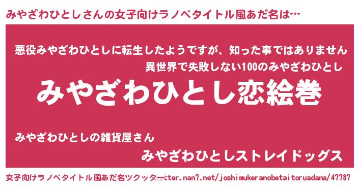 | 男性向けラノベタイトル風あだ名 | 『おまえをオタクにしてやるから、俺をみやざわひとしにしてくれ! 』 |